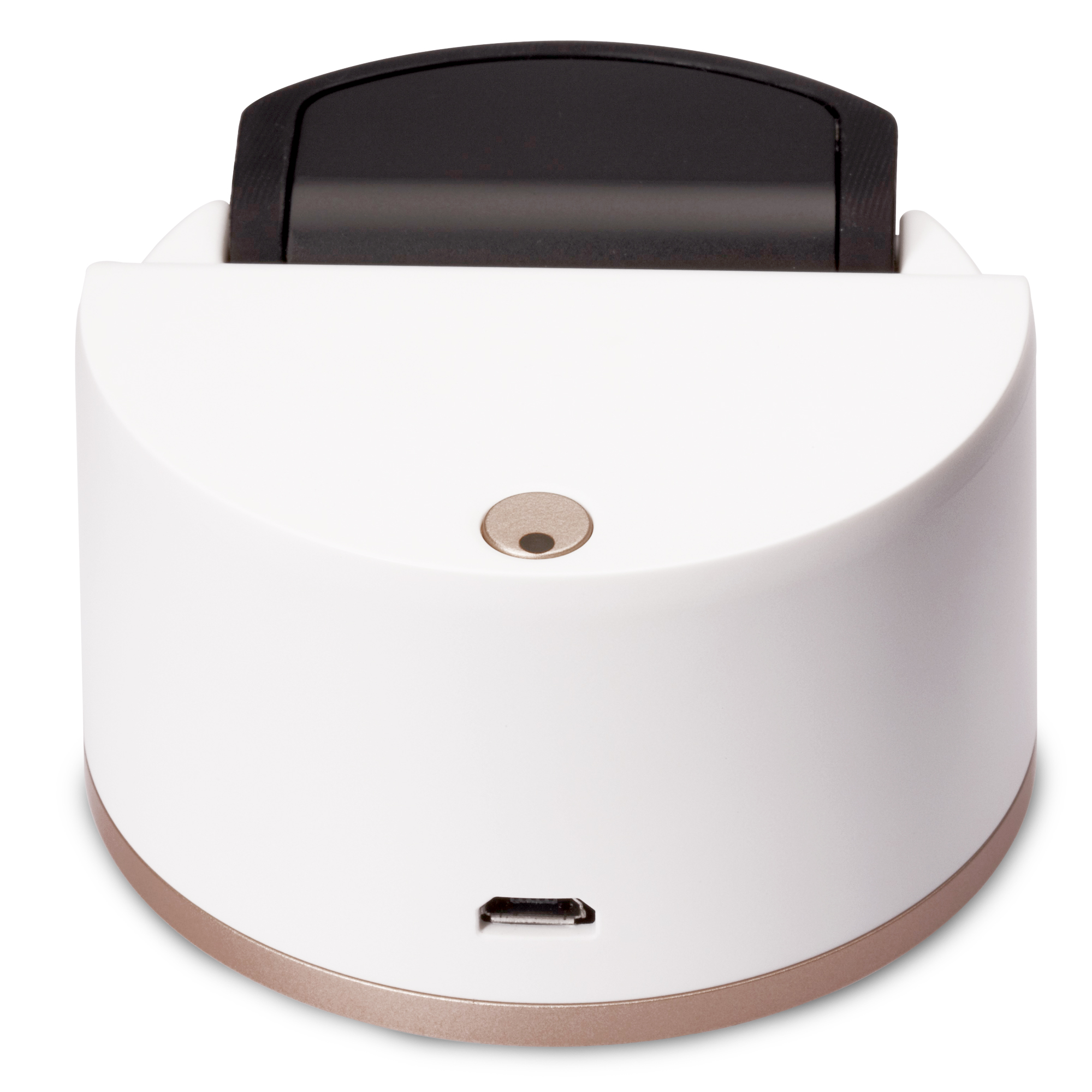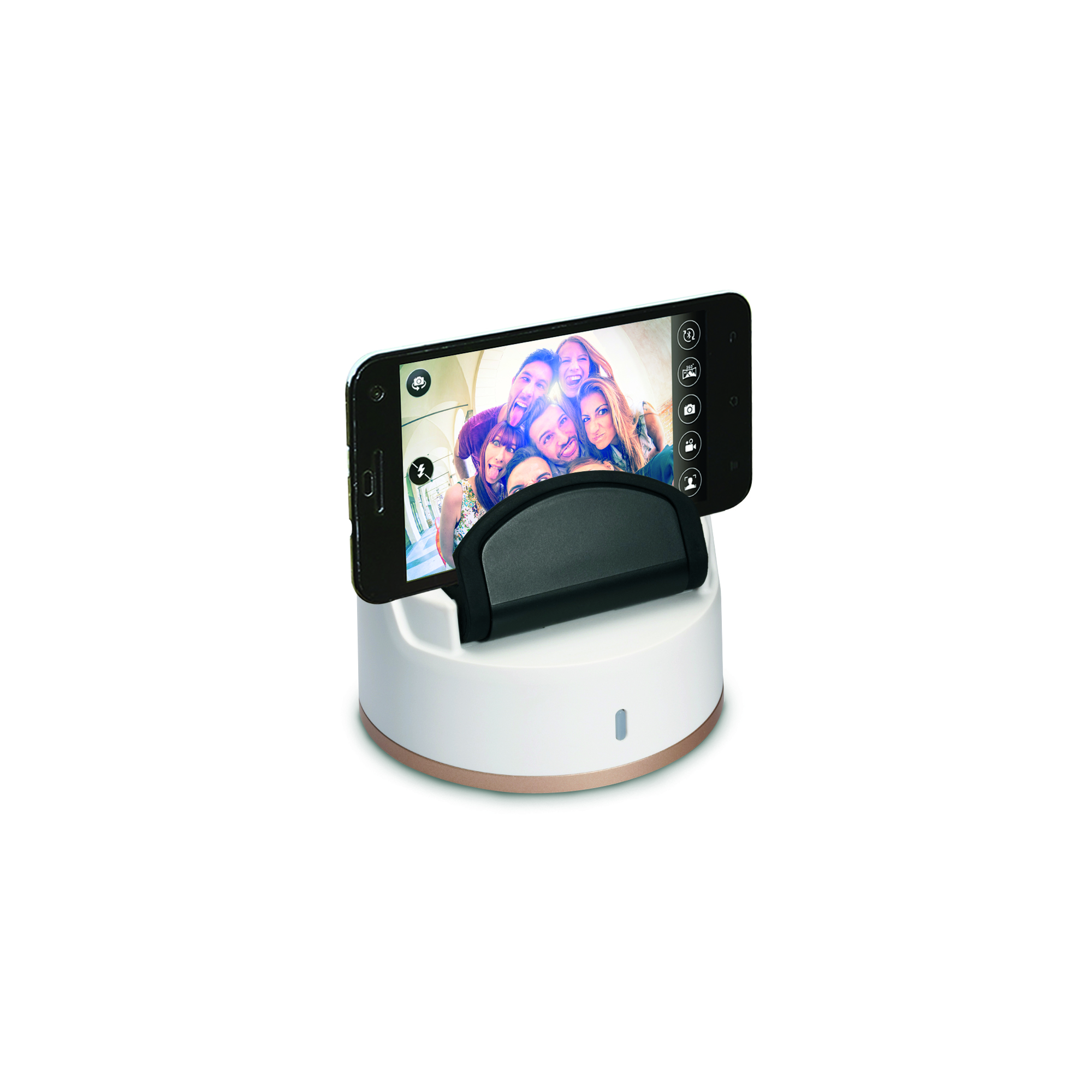 TERRATECs selfie robot Roobinho makes the perfect selfie a snap. The 360° rotating stand makes sure that the smartphones´s camera is optimally aligned to your selected photo subject completely hands free and automatically. The phone has to be inserted to the stand and connected to Roobinho via Bluetooth. The selfies can be shot in single, couple or group mode and release via auto face tracking. The wireless remote control activates the smartphone camera or allows to turn Roobinho manually.